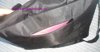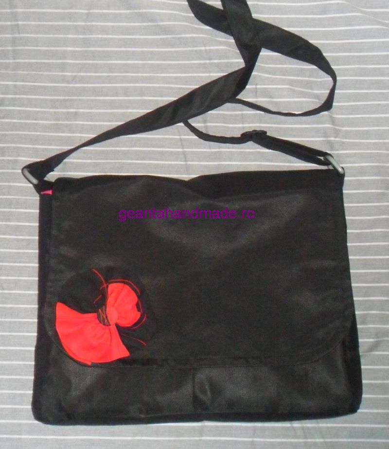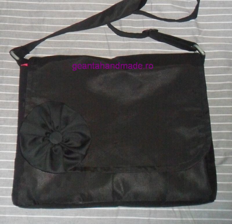O geanta tip mesager, din bumbac negru cu striatii, captuseala de bumbac culoare ciclam. Are ca sistem de inchidere fermoar si o clapa cu capsa magnetica. Sub clapa si sub capsa magnetica mai sunt 2 buzunare cat tine geanta. Buzunar cu fermoar pentru chei in spatele gentii, 2 buzunare interioare, unul cu fermoar si inca unul (impartit in 2 mai mici) fara inchidere. Breteaua se poate ajusta dupa dorinta. Are si 4 flori detasabile, in culorile dorite de clienta, rosu, maron, mov si negru. Florile au ace de brosa pe spate. Dimensiuni flori: intre 10 cm si 13 cm. Dimensiuni geanta: 26 cm, 34 cm, 4,5 cm. Bretea 130 cm ajustabila.