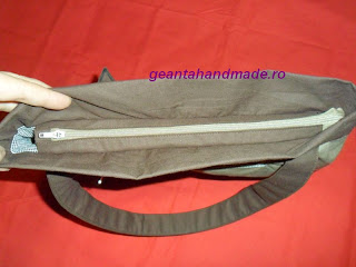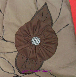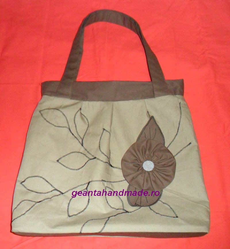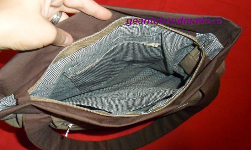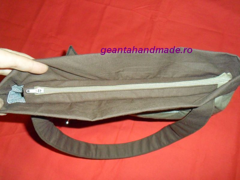 O geanta handmade, brodata, din bumbac 100%, culoare maron inchis cu maron deschis, brodata cu ata de brodat neagra. Captuseala dintr-o stofa subtire, carouri negru cu alb/gri. 2 bretele. Are ca sistem de inchidere fermoar. 1 buzunar exterior pentru chei, 2 buzunare interioare, unul cu fermoar si unul fara. Dimensiuni: 36cm/35cm/ 6 cm latera, bretele 60 cm. Floarea este detasabila.