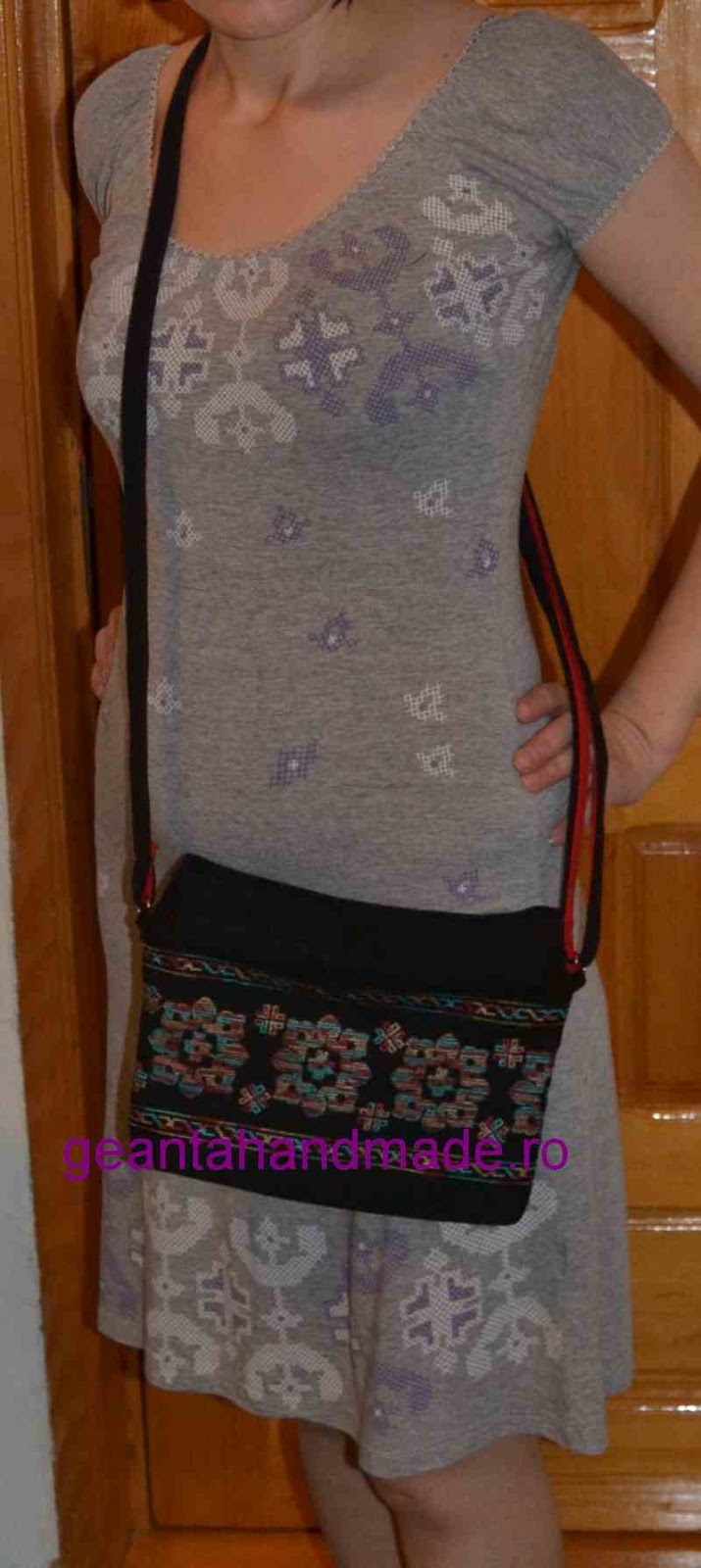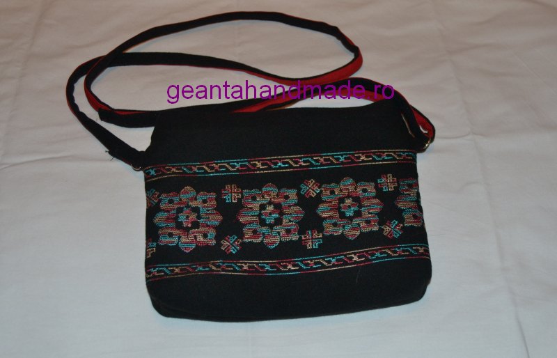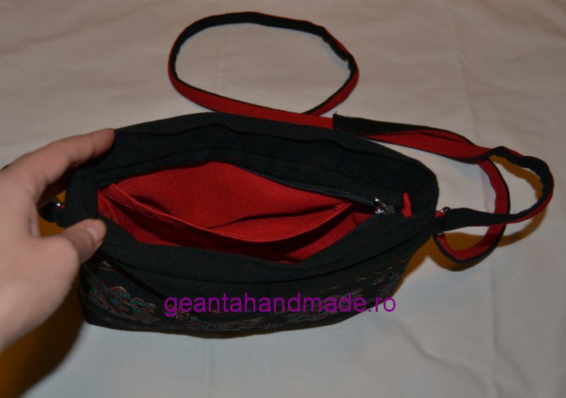 O geanta din stofa neagra de lana, brodata. Dimensiuni: 19cm/26cm/4cm. Se inchide cu fermoar, are captuseala rosie