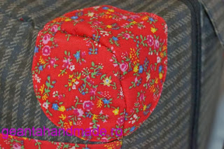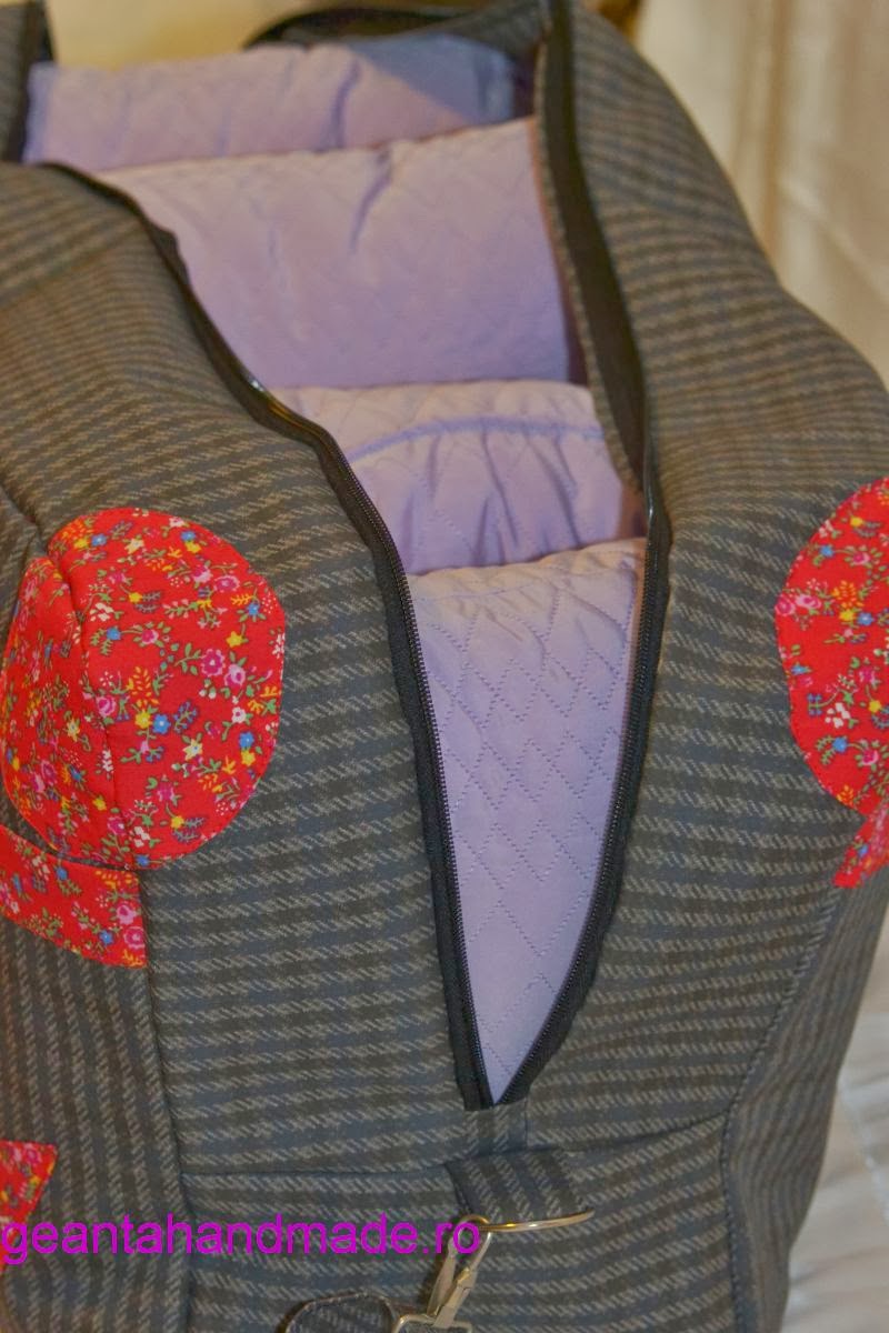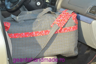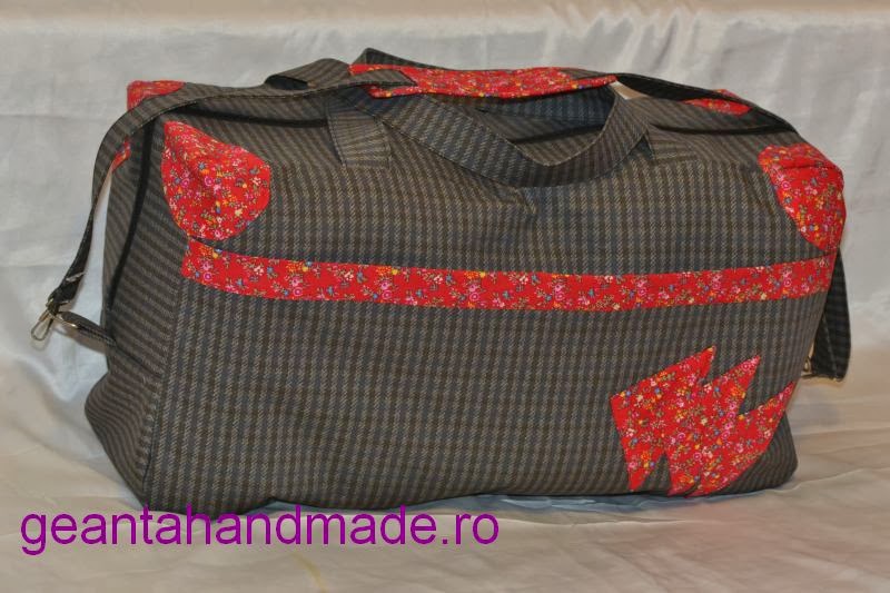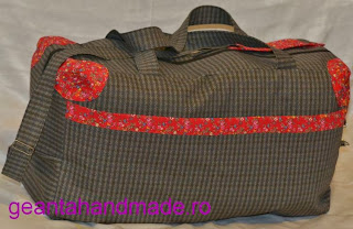 Este din material din care am facut si ruxacul, material de la Elouise. Dimensiuni: 62cm/34cm/21cm. Am facut colturile dupa cartea de confectionat genti de la LIDL, a fost ceva de munca la imbinari dar a iesit zic eu. Iti multumesc Karina pentru provocare, cine stie cand o lucram! Accosoriile sunt luate de la cealalta geanta de voiaj care s-a descusut destul de repede. Mai am de pus arici la buzunarele mari si de facut banda cu arici de la barete.